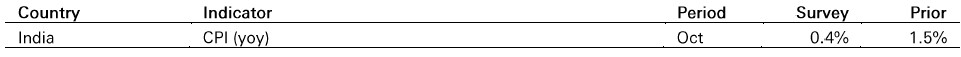 In India, CPI inflation likely fell to 0.4% yoy in October, from 1.5% yoy in September, on lower food prices and GST rates.