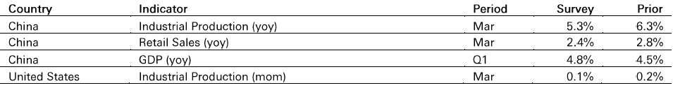 In China, Q1 GDP growth was likely supported by strong January-February activity, particularly exports, and aided by front-loaded fiscal policy support. Industrial production is expected to hold up in March, with limited disruption from the energy shock so far, while retail sales likely softened as the LNY holiday boost faded and the high base from last year’s trade-in subsidies kicked in.