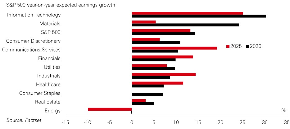 #2. Mega-cap tech and AI stocks – which have driven US profits and price gains for three years – are diverging a bit. The sector still dominates the broad profits picture, but investors are being picky, and some stocks have slumped after disappointing the market. There are signs that AI could negatively impact legacy software firms, as well as persistent concerns about stretched valuations, high concentration, and a potential bubble in AI stocks given the uncertainty about when vast capex investments will pay-off.