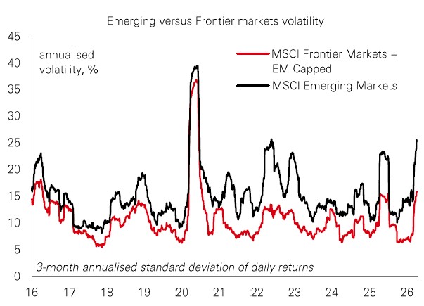 • A lot has been said about the resilience of emerging market (EM) assets during the Iran conflict so far. But what’s also been quite impressive is that the performance of frontier market stocks during this phase. The peak drawdown was limited to around 8%, versus 13% for EM.