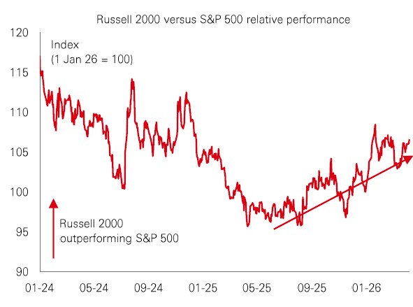 Since last summer, the trend has been for small caps to outperform large caps, helped by expectations of more rate cuts in 2026. So, when markets repriced in a much more hawkish direction last month, it would have been reasonable to assume that small caps would be pummelled. Rather, following an initial sell-off, there was a quick bounce back.