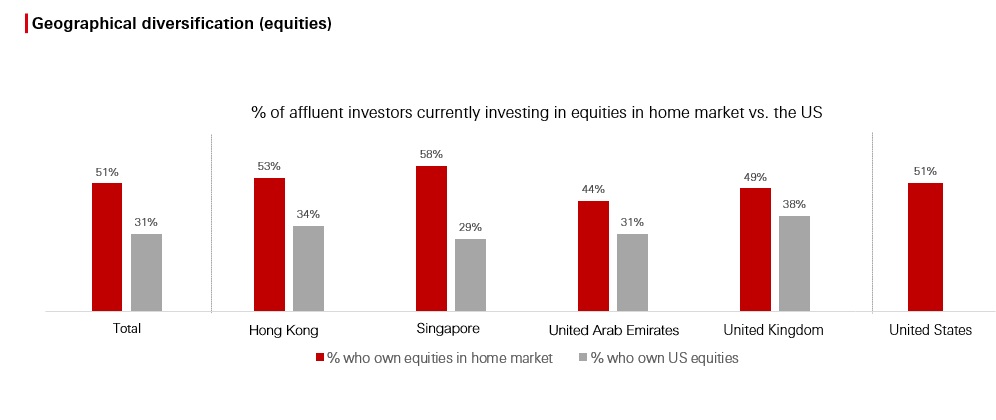 A third of affluent investors have equity exposure to the US. And one-third of the affluent investors in the major international wealth centres are keen to invest in other markets.