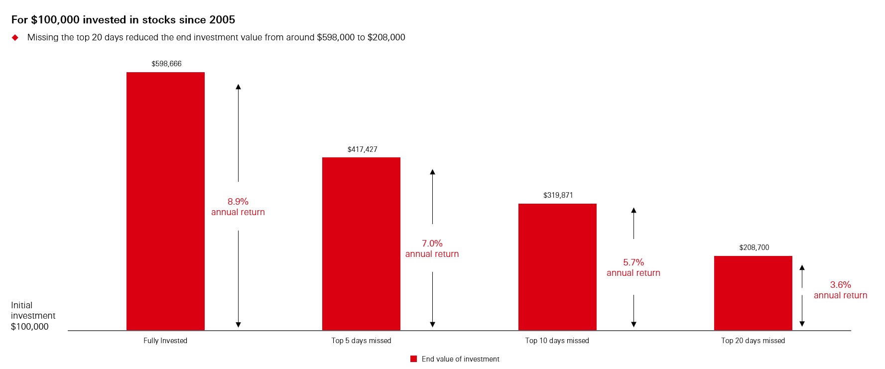 Chart 3 shows $100,000 invested in stocks since 2005. Missing the top 20 days reduced the end investment value from around $598,666 to $208,700.