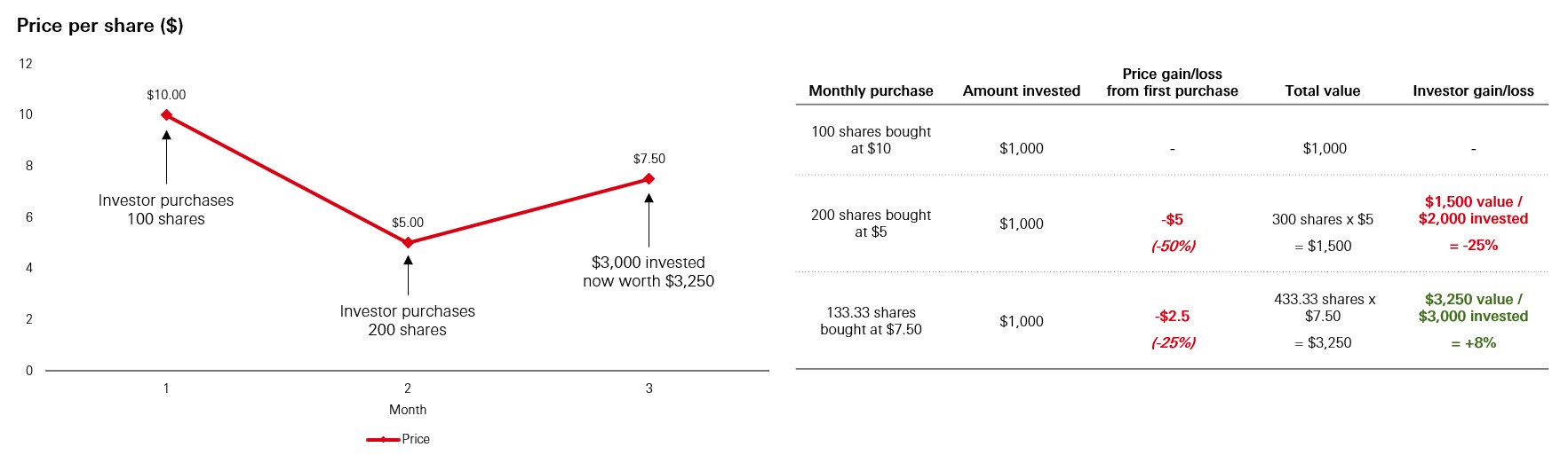 Investing regularly means continuous investment regardless of what is happening in the markets. When investors make fixed regular investments, they buy more units when prices are low and less when prices are high. This will smooth out the investment journey and average out the price at which units are bought, thus reducing the risk of investing a lump sum at the wrong time, particularly amid market volatility. The longer the time frame for investment the better, because it allows more time for investments to grow via the compounding effect.