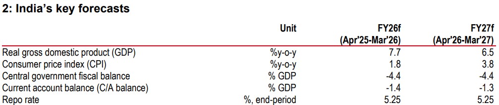 On growth, GDP numbers were raised, from 6.8% to 7.3% in FY26, but in our view, primarily on the back of stronger-than-expected numbers in 2QFY26. The governor spoke about the exports sector being weaker in the press conference and he also said that he expects “growth to somewhat slow”.