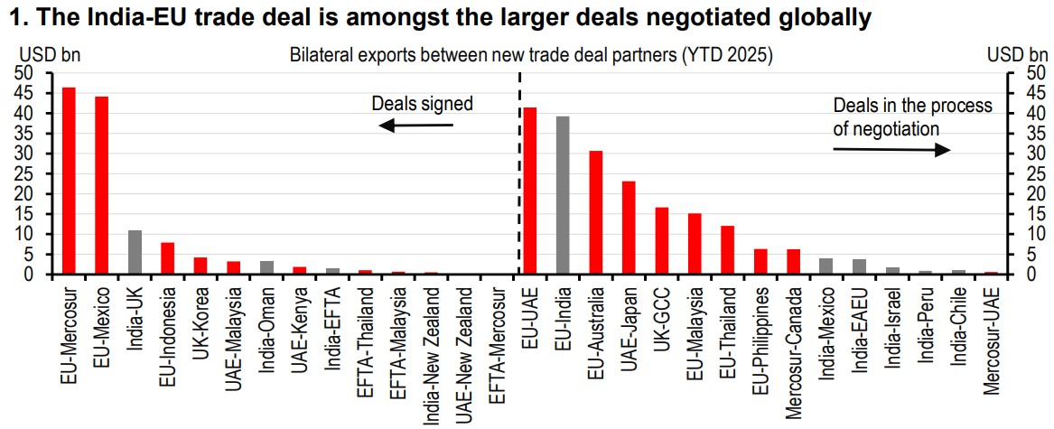 After a two-decade long negotiation, India and the EU have finally sealed a Free Trade Agreement (FTA). The implementation is likely in 2027, following legal vetting and EU parliamentary approval. This is amongst the larger global trade deals recently negotiated. India and the EU combined account for around 25% of global GDP, and the deal is billed as the largest ever made by both sides. The potential for growth is substantial, given the trade in this region is only 0.6% of global trade. The benefits could eventually go beyond goods trade, including larger FDI flows, more services trade, and strategic diversification.