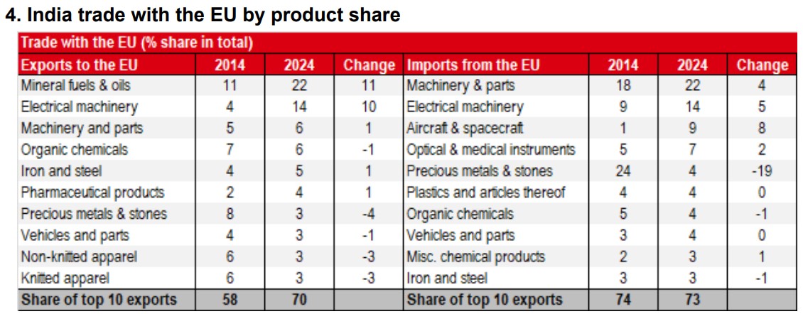The FTA is described as the “mother of all deals” – which is balanced, yet ambitious and mutually beneficial for both parties.In FY25, India-EU goods trade was almost USD140bn. Details show that the India-EU trade is built on complementary value chains. The EU sells capital goods and industrial inputs to India (such as high-end machinery, electronic components, aircraft, and medical devices). India sells labour-intensive and consumer-focused goods to the EU (such as smartphones, garments, footwear, pharmaceuticals, auto parts, and diamonds, though fuel tops the list).