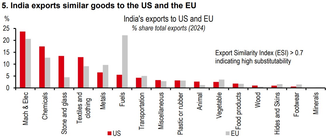 Substitute for US exports. The 50% tariff imposed by the US on India’s exports has led to efforts by Indian exporters to look for new destinations. Interestingly, India’s exports in value terms to the EU (USD76bn in FY25) and the US (USD87bn) are in the same broad range, and the products traded are also similar (see exhibit 5, barring the large fuel exports to the EU). From that perspective, the EU could be a region that India wants to focus on, to redirect some of its exports.