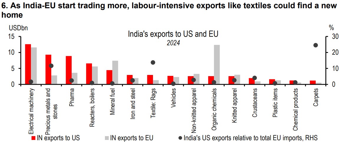 Indeed, labour intensive sectors, such as textiles and gems and jewellery, were most at risk with the US tariffs (see exhibit 6). These may now benefit from tariff elimination in the India-EU trade deal.