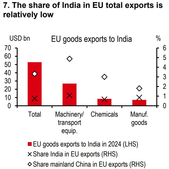 Meaningful unrealised potential. As a block, the EU is India’s largest trading partner. In FY25, India exported USD76bn of goods to the EU and bought USD61bn of goods from the EU. Prior to this trade deal, the ITC export potential map showed that c50% of India’s export potential to the EU remains untapped. As per ITC, large gains are possible across several sectors – machinery, jewellery, electronics, pharmaceutical components, and textiles[@india-economics-05-01].