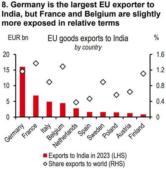 The trade deal could especially benefit Germany, France, and Italy as they are the EU countries that export the most to India in absolute terms (with respectively 35%, 15%, and 11% of EU exports to India, see Exhibit 8). In relative terms, India represents the higher share of total exports for France (1.4%), Belgium (1.3%), Germany (1.2%),and Finland (1.1%).