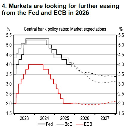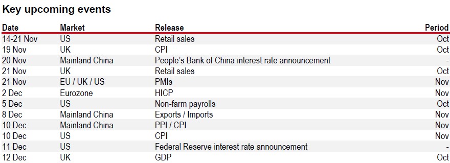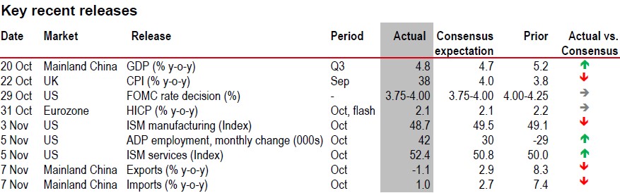 In Europe, most eurozone countries submitted their draft budget plans for 2026 to the European Commission, with the fiscal stance likely to turn expansionary. In the UK, lower-than-expected inflation has increased odds of a rate cut sooner rather than later, but we expect Bank of England to remain on hold until April 2026. Meanwhile, in mainland China, the 15th Five Year Plan unveiled an increased focus on self-reliance, with an emphasis on high quality development fuelled by technology and innovation. The slowdown in recent data, particularly on the investment side, makes the need for government support more pressing.