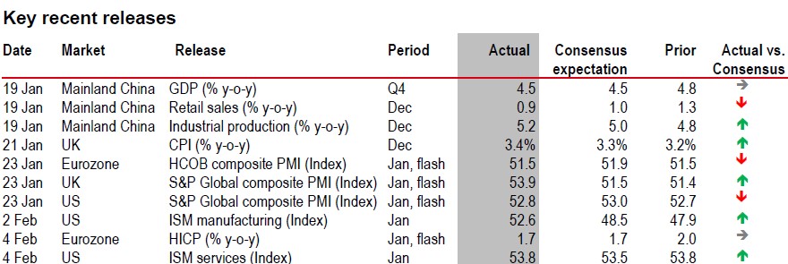 On the trade side, there has been no shortage of US tariff noise: US ambitions for Greenland – and associated warning of 25% tariffs on Europe – de-escalated post-Davos. Tariff threats against Canada and Korea, on any country selling oil to Cuba and – following recent protests – any country doing business with Iran, have all followed. But the only new US tariffs imposed so far this year are the 25% tariffs on a very narrow category of semiconductors and even those are lower than feared.