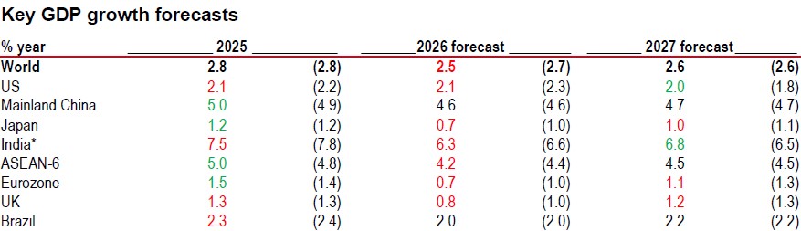 Note: *India data is calendar year forecast here for comparability. Previous forecasts are shown in parenthesis and are from the Macro Monthly dated 6 October 2025.